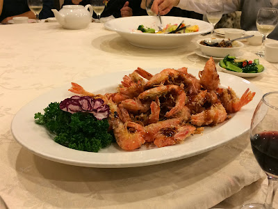 前菜やサラダに続いて、いよいよ一品料理が始まりました。最初は巨大な海老の唐揚です。頭も尻尾もみんな香ばしくてクリスピーです。