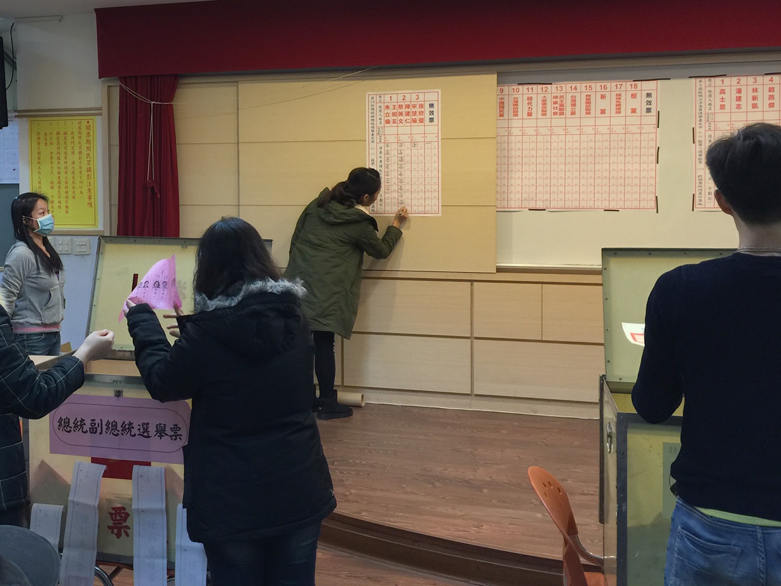 投票会場を見た後で、中山國中のグラウンドでランの練習でしばらく走りました。4時になり投票が締め切られたので、投票終了後はどうなっているのかと見に行ってみたところ、晨運社のメンバーの陳さんがいて投票が締め切られた後は投票会場に入れるし、開票作業を見ることもできるとのことでした。日本では一般人が許可無く開票会場に入ることはできないはずです。とても驚きました。
